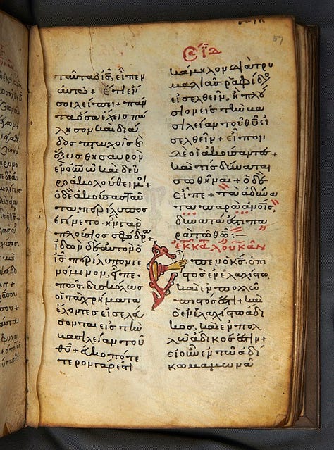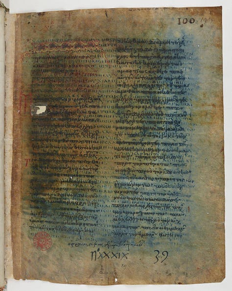 Top-bottom/left-right, Papyrus copy of John 18:31-33 known as P52, palimpsest Codex Ephraemi Rescriptus from the 5th century, and the Keble Greek Lectionary dated 11th-12th century. Images via public domain, CSNTM, and Keble College.