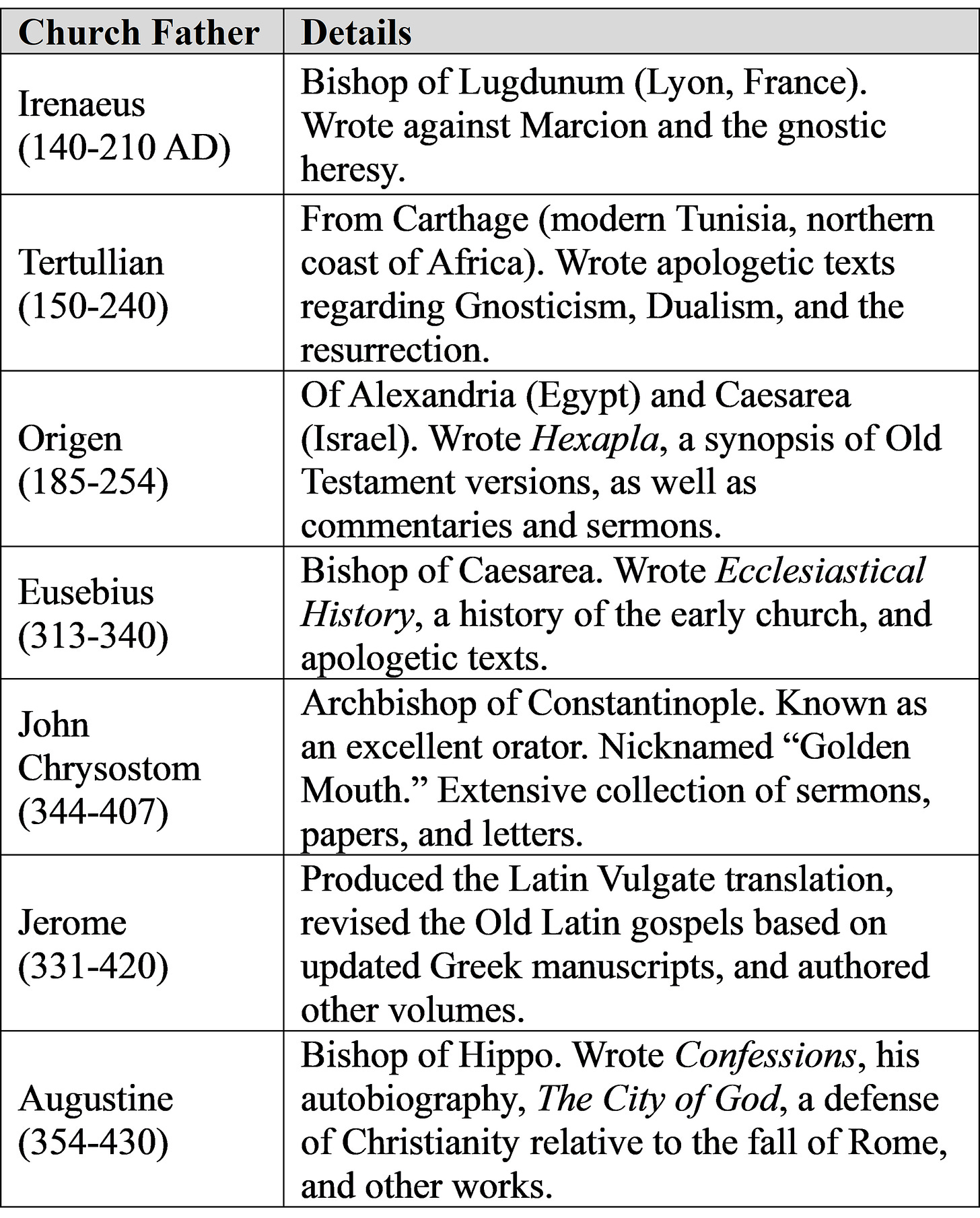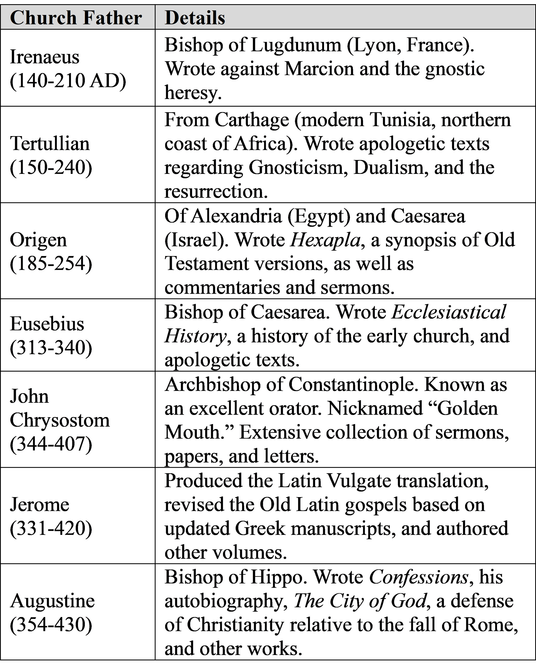 The table below lists selected Church Fathers providing New Testament quotations, including when they lived, where the ministered, and what they wrote.